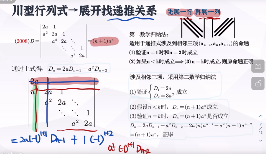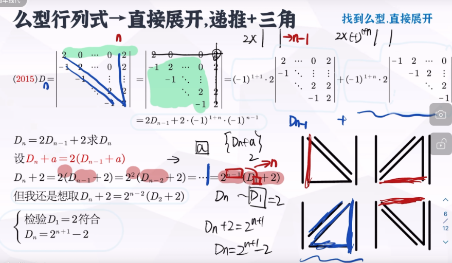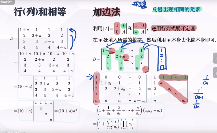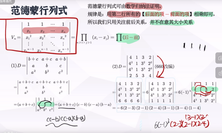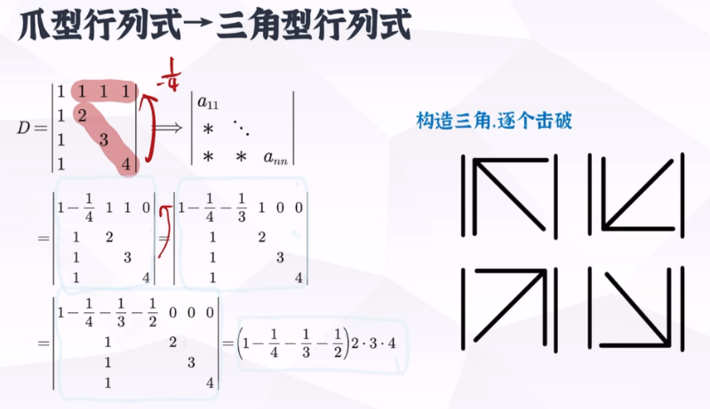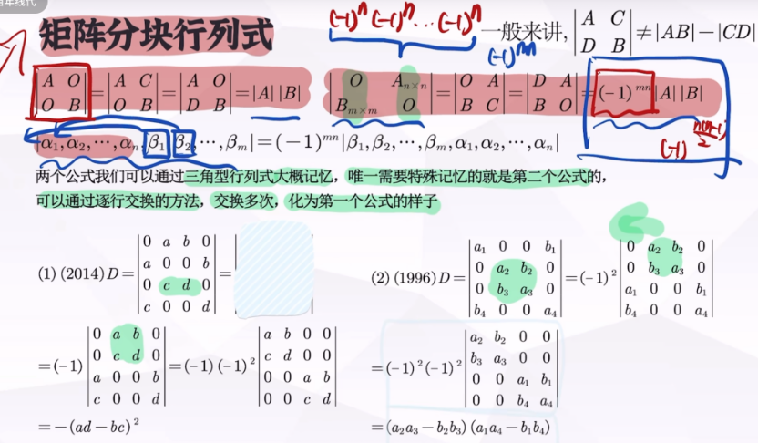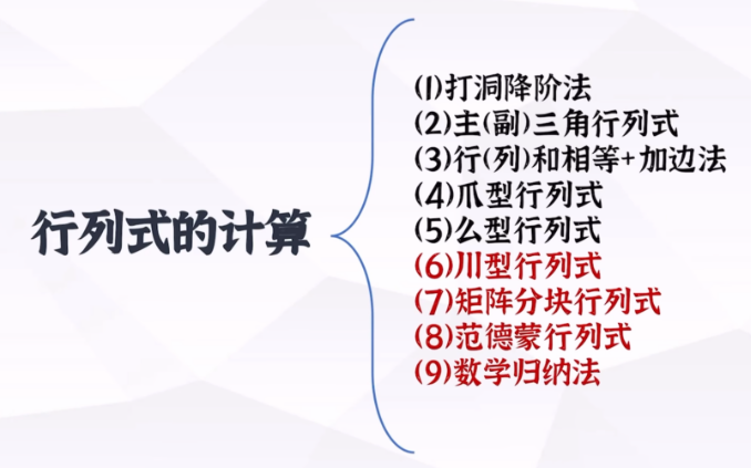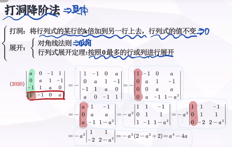 用处: 0成片出现 or 0很多 核心方法: 以0多的列(行)为基准,先把它划上,再选合适数量个行(列),形成子式and余子式 易错点: 有且仅有余子式需要* pow(-1,划去的所有行标和+所有列标和):变代数余子式 子式不要,余子式别忘