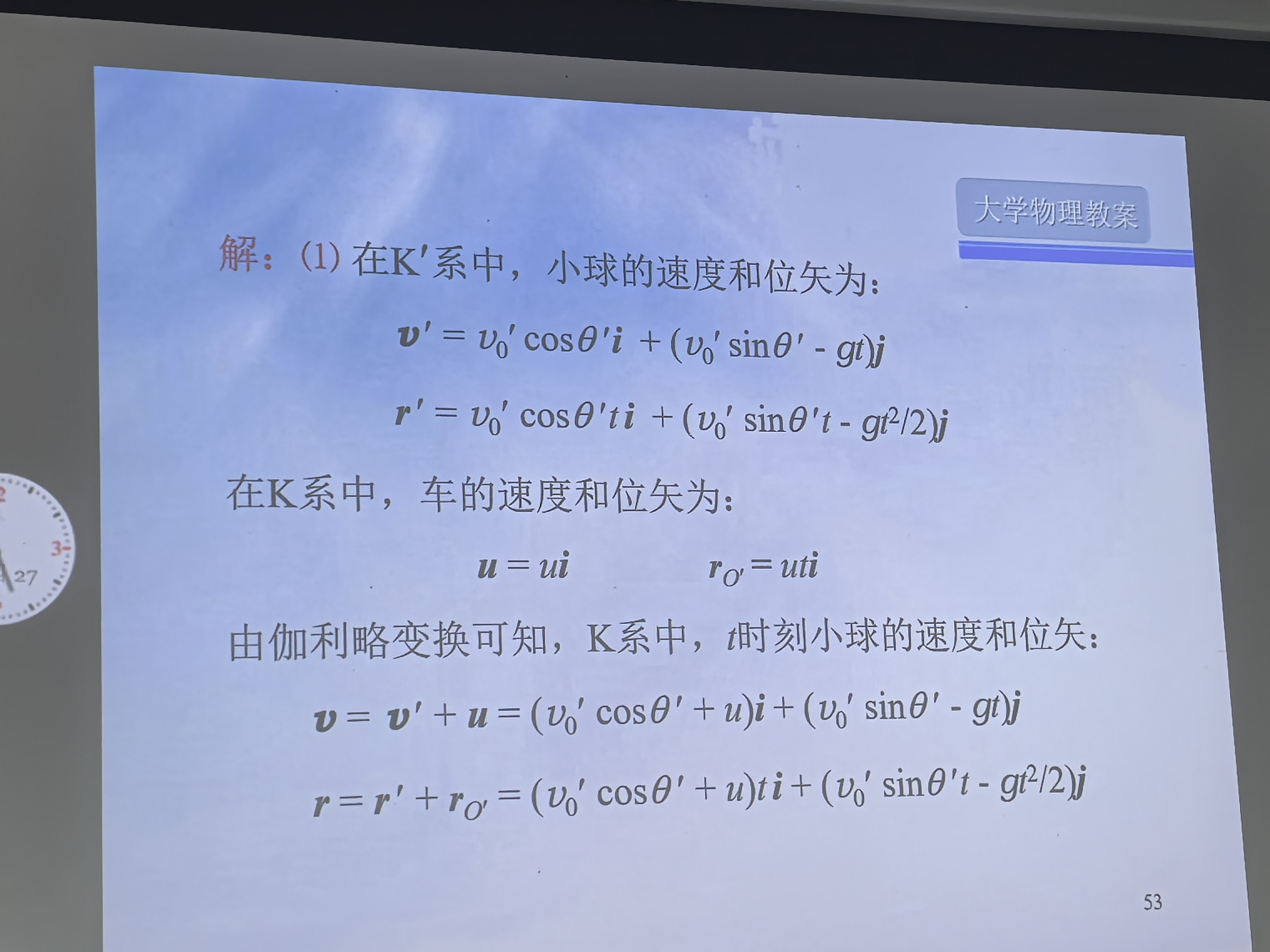 在经典力学中, \(t = t'\) , 绝对速度\(v\) = 牵连速度\(u\) 与 相对速度\(v'\) 的 矢量和