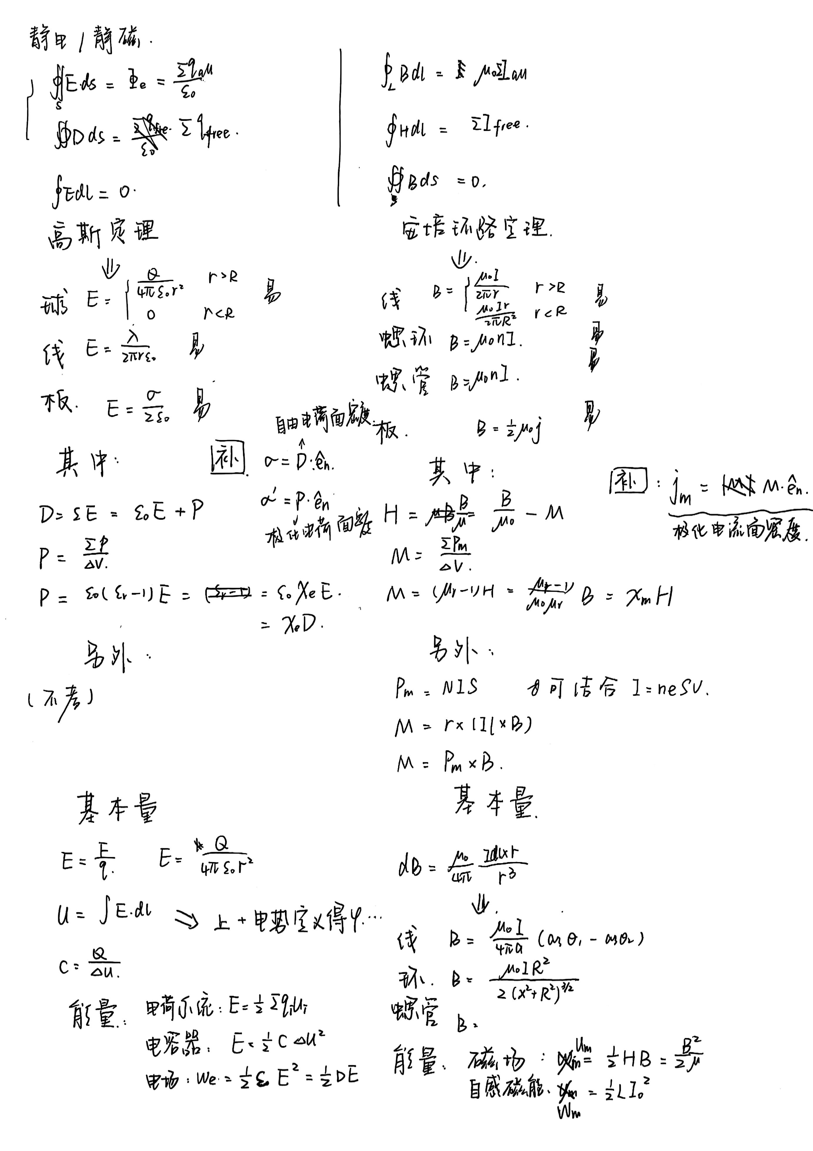 | 场量 | 电位移矢量 \(\mathbf{D} = \varepsilon_0 \mathbf{E} + \mathbf{P}\) | 磁感应强度 \(\mathbf{B} = \mu_0(\mathbf{H} + \mathbf{M})\) | 描述介质中电场/磁场与自由源关系的场矢量 |